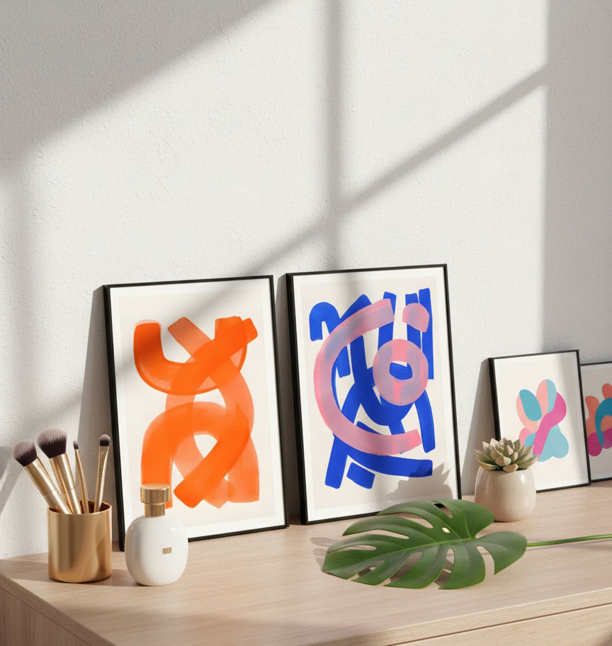 (without frames) This coordinated art set features two distinct yet complementary compositions that instantly elevate any space. These pieces capture the energy of fluid motion and confident brushstrokes, perfect for a contemporary, mid-century modern, or bohemian interior.